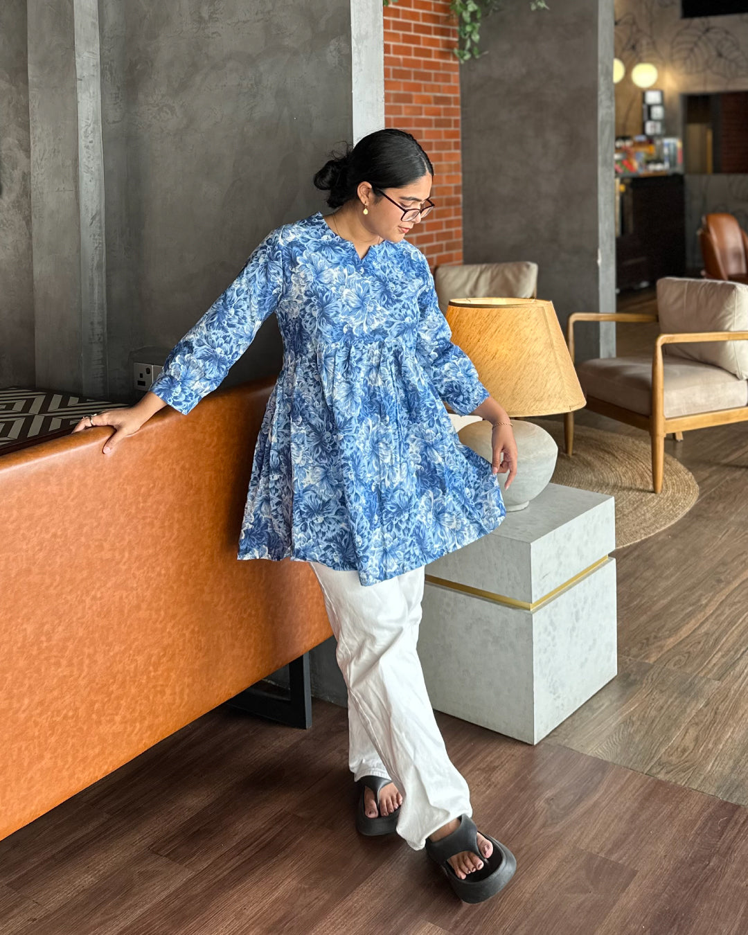 The Blue Mirage Peplum Top is a 30-inch kurti designed with elegance and ease in mind. Featuring a serene all-over floral pattern in shades of blue, this cotton peplum-style top offers a relaxed fit and a graceful fall. Ideal for weekend wear or minimalist office dressing.