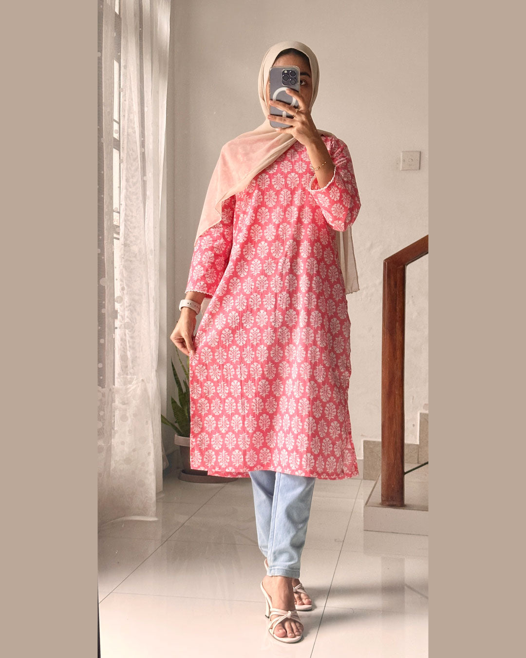 Add a touch of sophistication to your wardrobe with this 40-inch kurti featuring a delicate white design on soft pink fabric. The soothing pink base is beautifully complemented by intricate white patterns, making this kurti a timeless addition to your collection. Perfect for casual wear, office attire, or semi-formal occasions, this piece combines elegance with versatility.