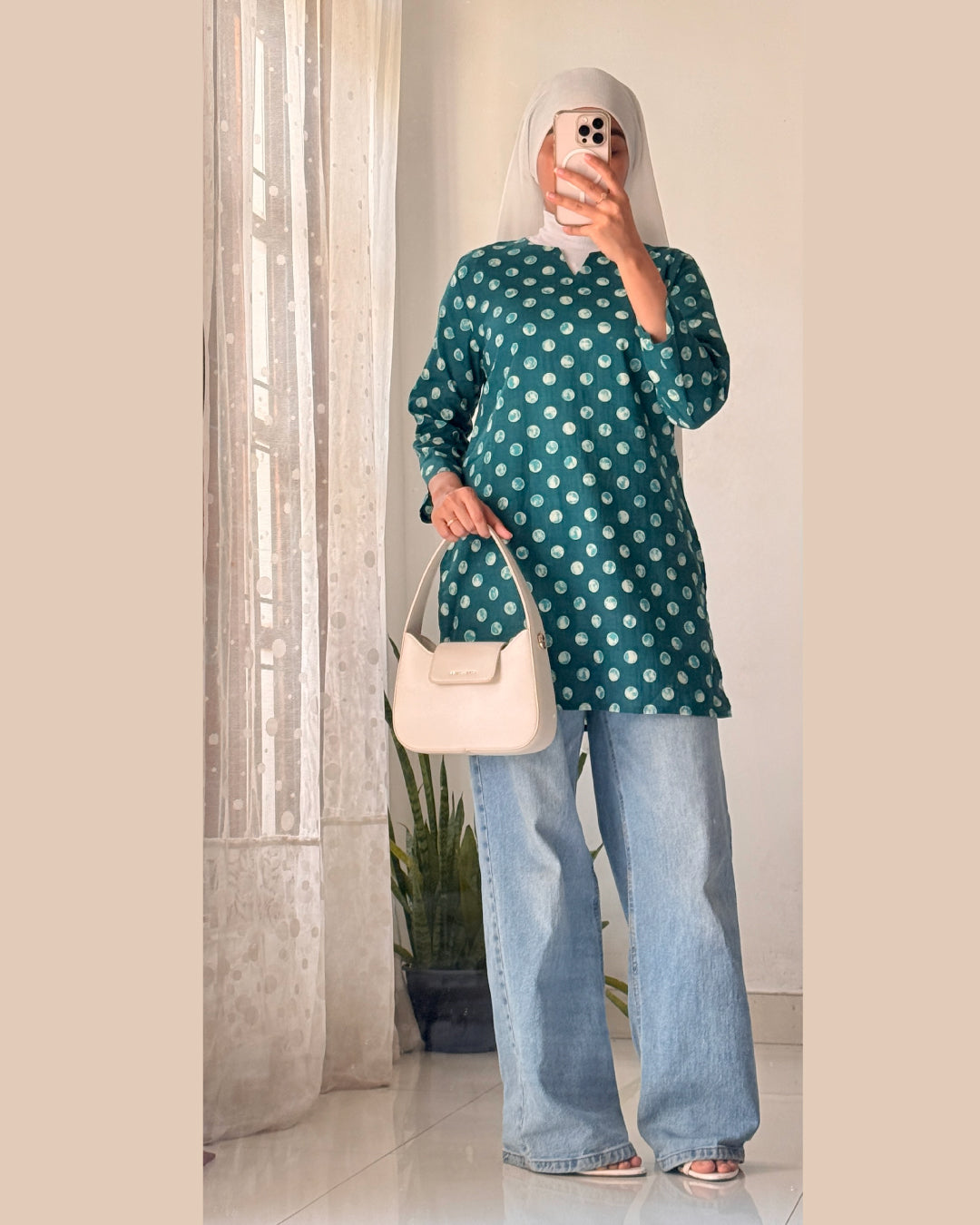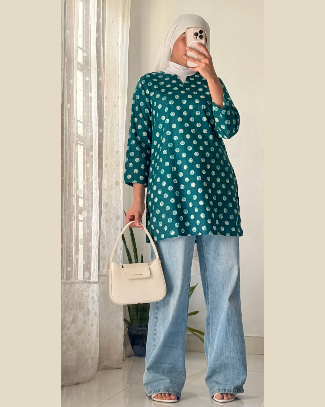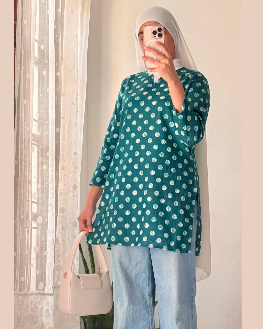 The teal base with dotted patterns brings a refreshing youthful energy. It’s perfect for a casual day out, college, or even work. Style it with denim or palazzos for a relaxed yet put-together vibe. Pair with silver oxidized jhumkas and a sling bag for that Bollywood street-style desi look. Switch to white leggings and kolhapuri sandals for a traditional twist.