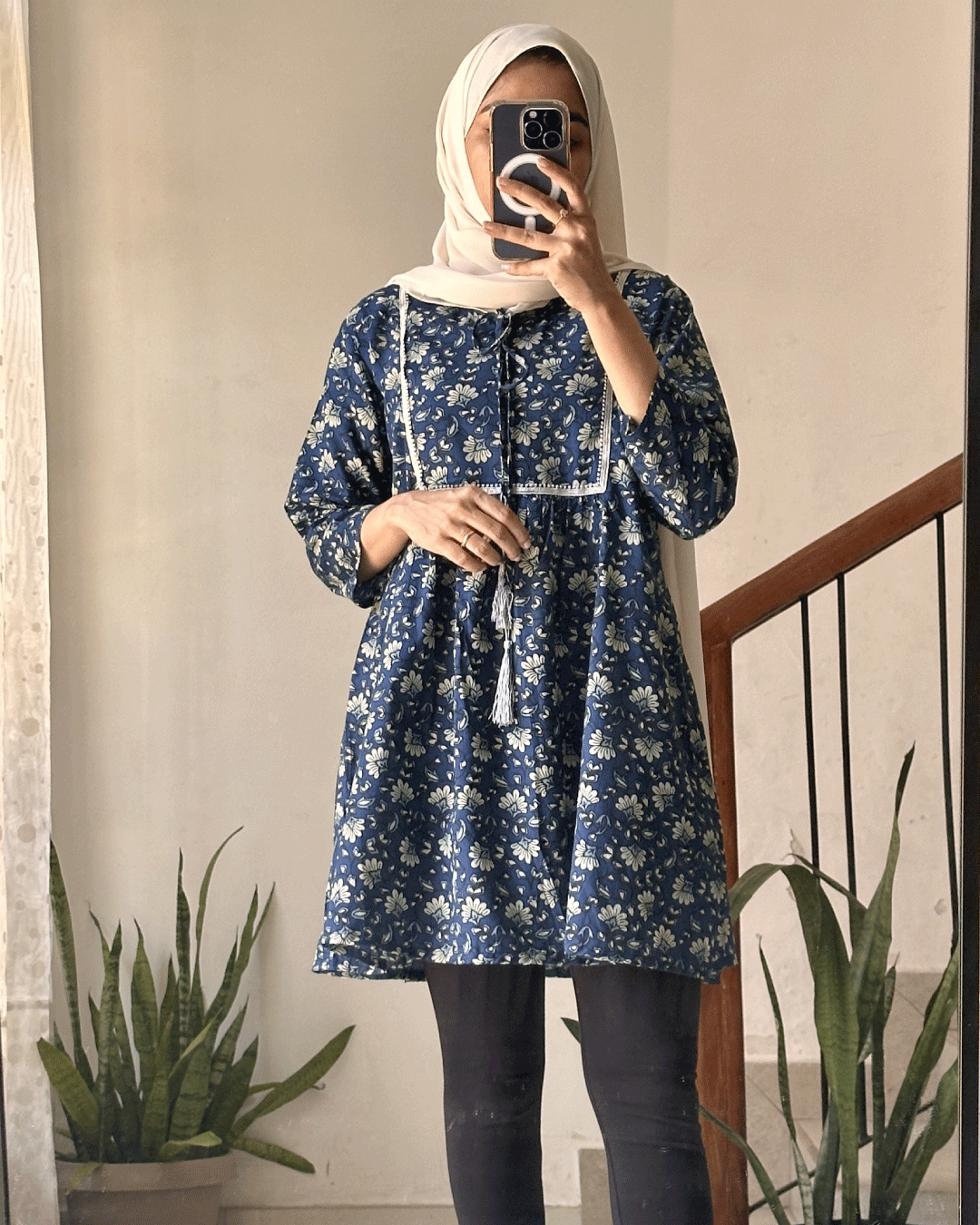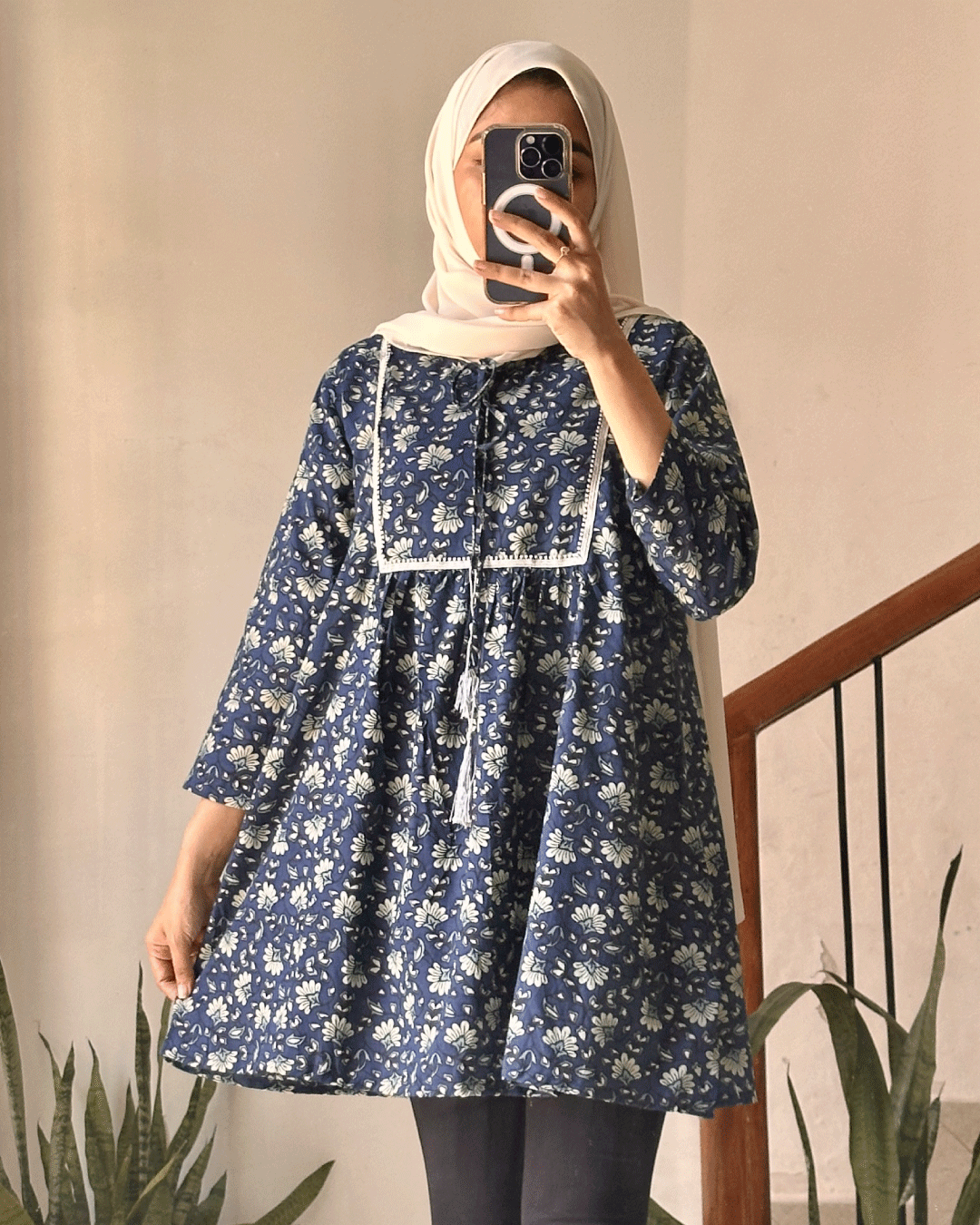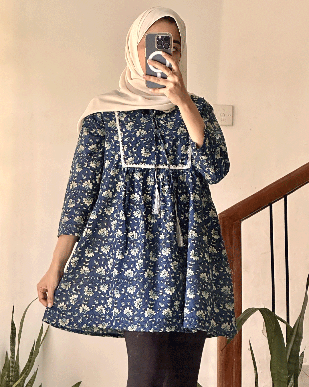A perfect blend of tradition and elegance, the Midnight Bloom short kurti features exquisite floral hand-block prints on a deep navy base. The intricate lace-bordered yoke and delicate tassel add a vintage charm, making it a timeless wardrobe staple. With a 30-inch length and a relaxed yet flattering silhouette, this kurti is designed for effortless grace. The soft, breathable fabric ensures comfort while maintaining an artisanal, handcrafted appeal.