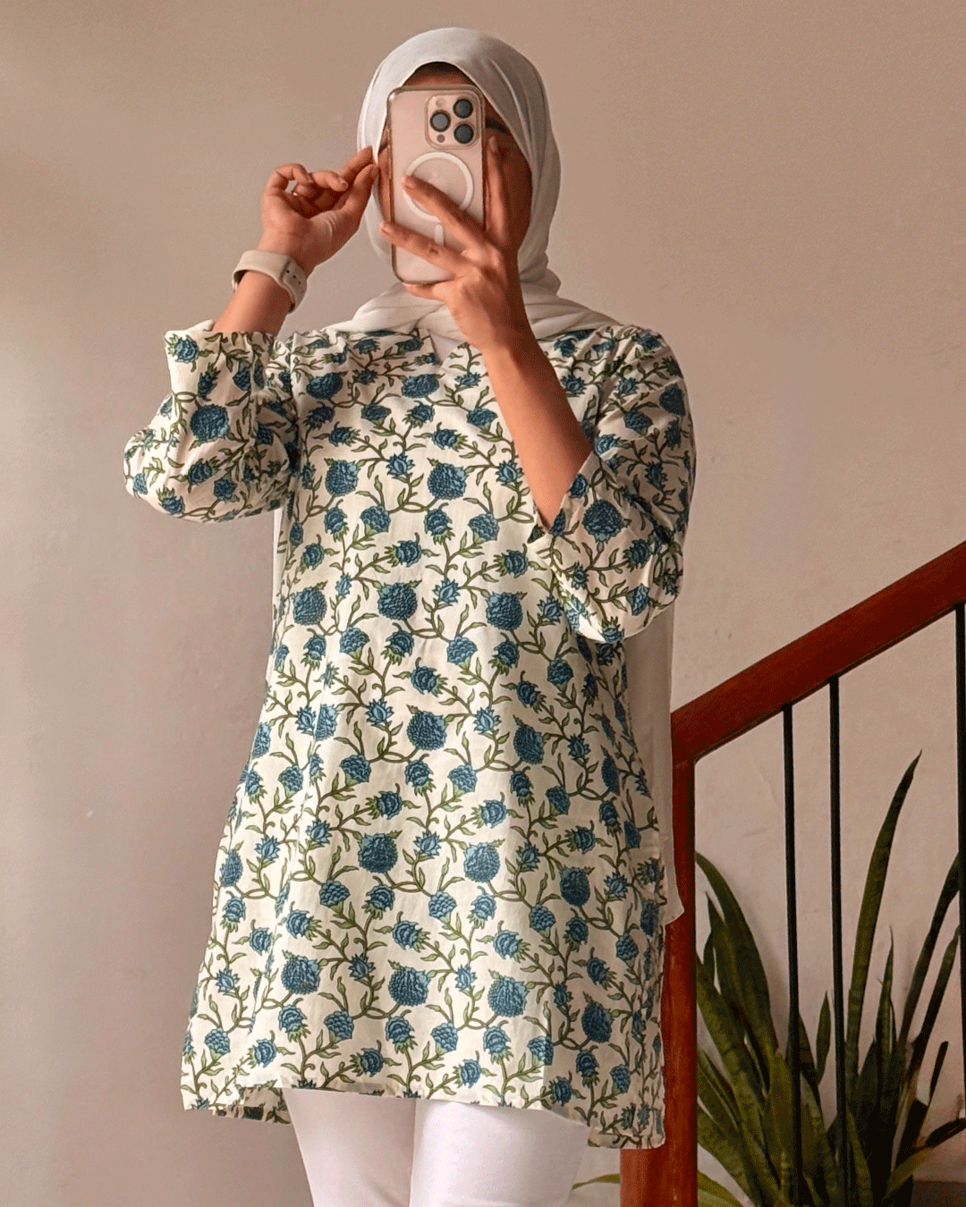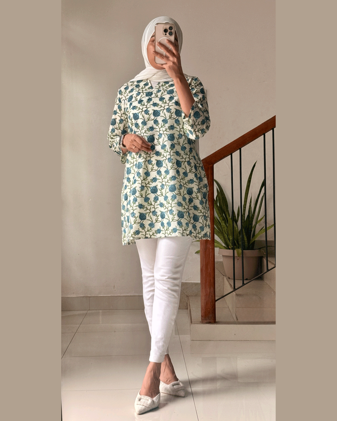 Step into timeless charm with Neel Kamal – 30 Inches of Regal Grace. Blue floral motifs entwine with olive-green vines across an ivory base, creating a classic kurti that whispers sophistication. The 30-inch length offers modest elegance, perfect for temple runs or elegant daytime daawats. A kurti that would make even Rekha nod in approval, this one’s a wardrobe staple for lovers of heritage style.