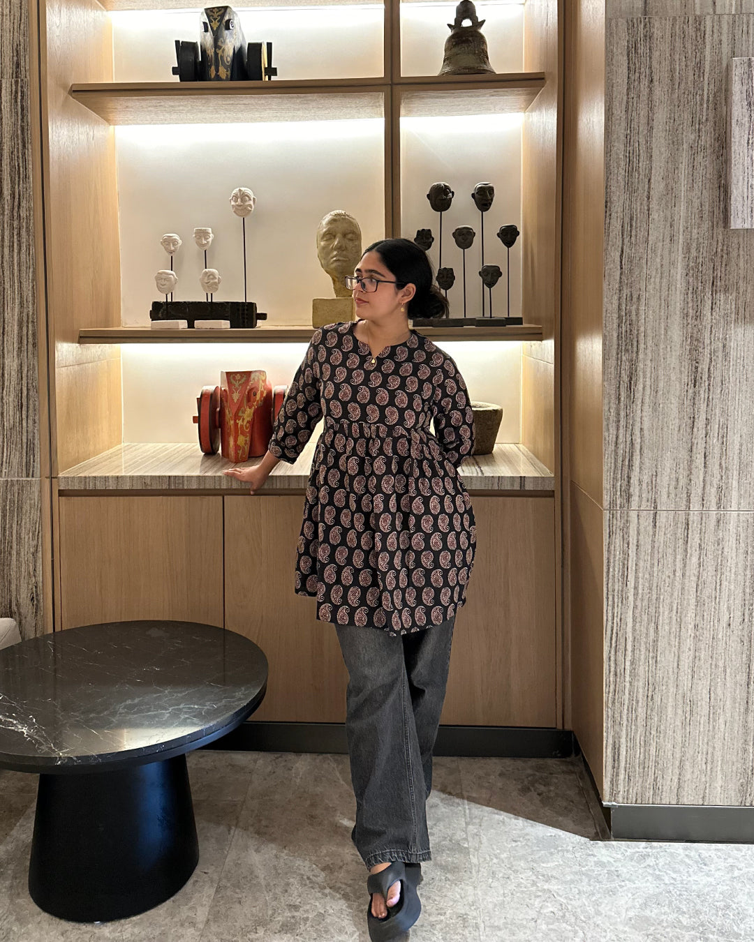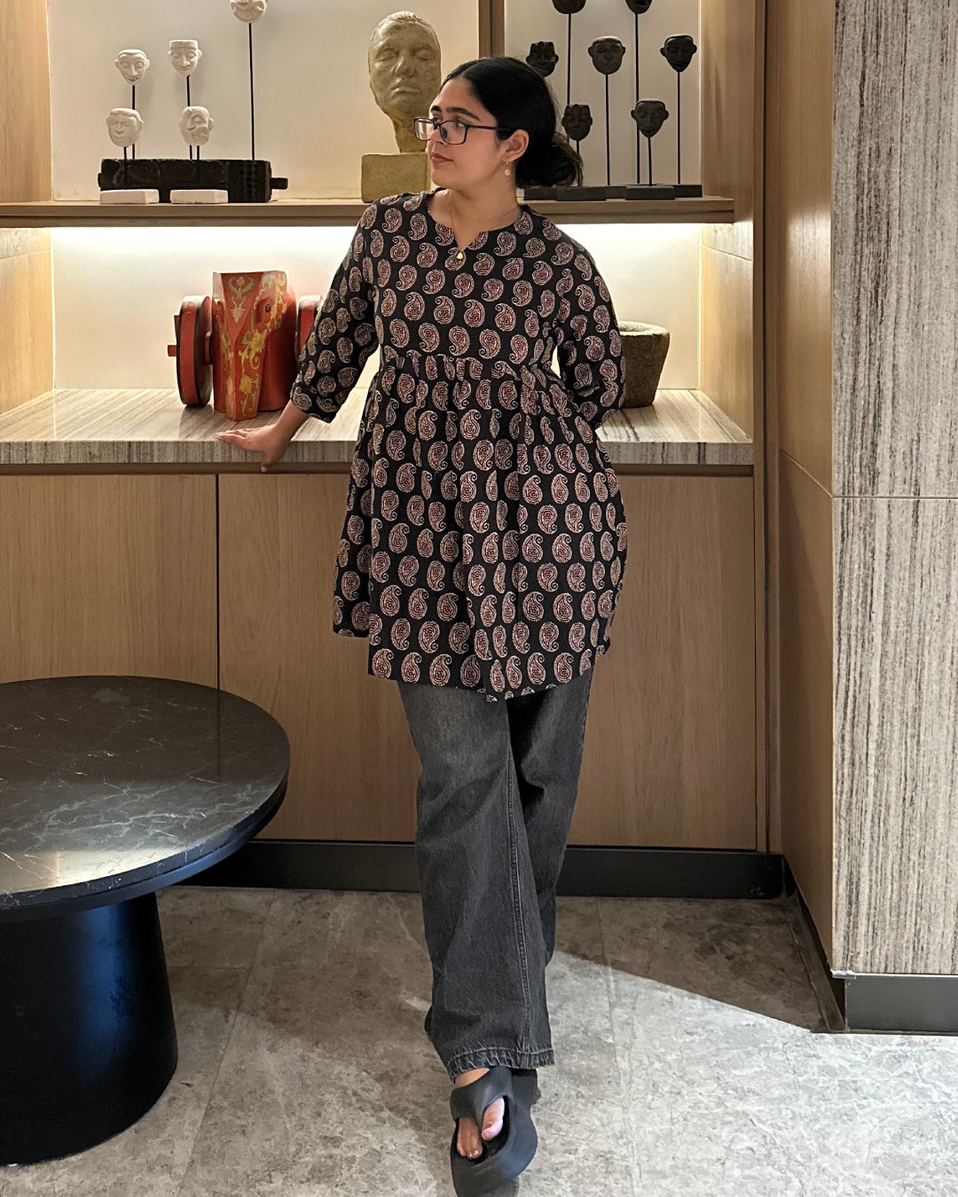 A sophisticated 30-inch kurti in deep black adorned with bold red paisley motifs, this peplum top adds elegance to everyday wear. Its structure flatters the figure while remaining relaxed and breathable.