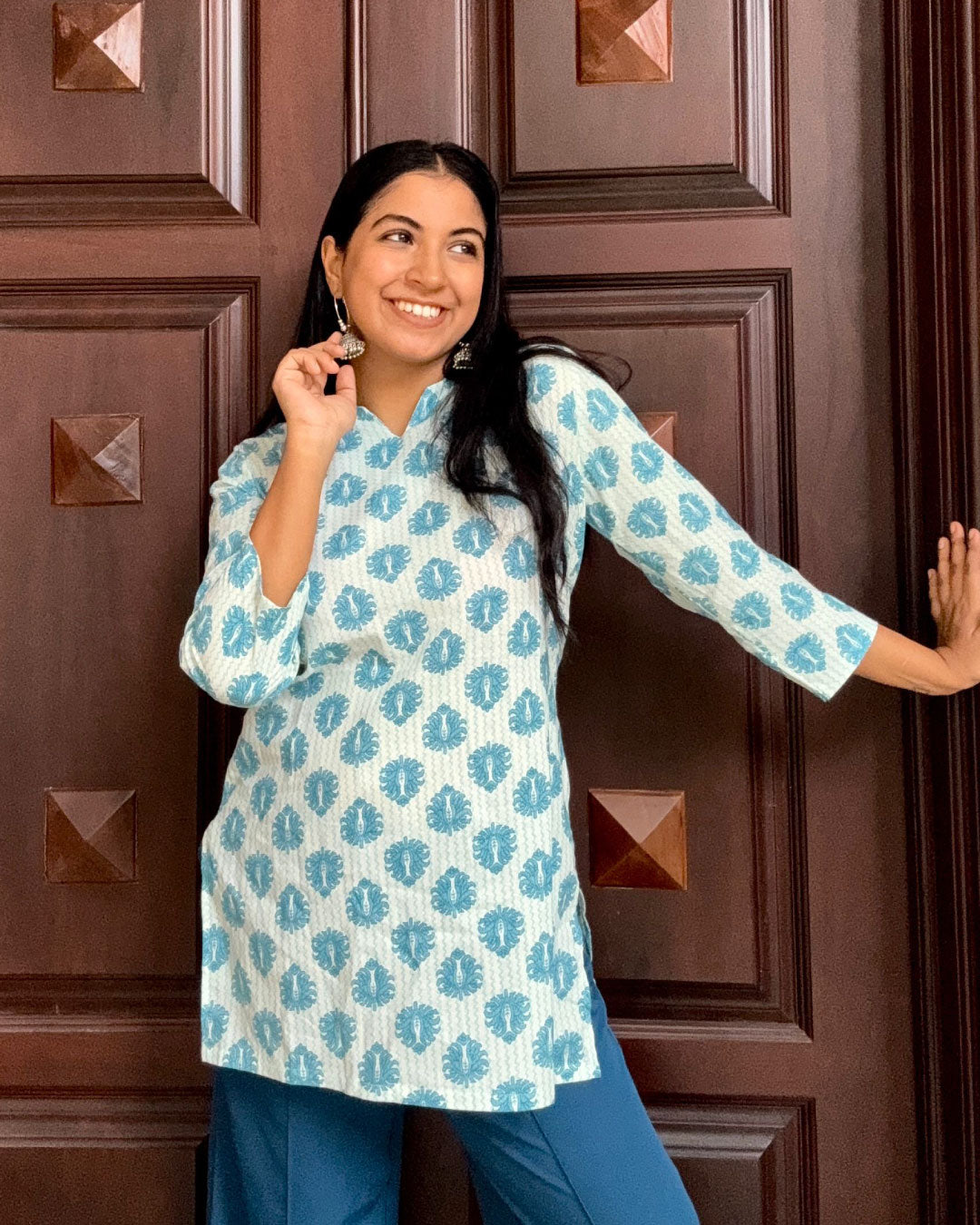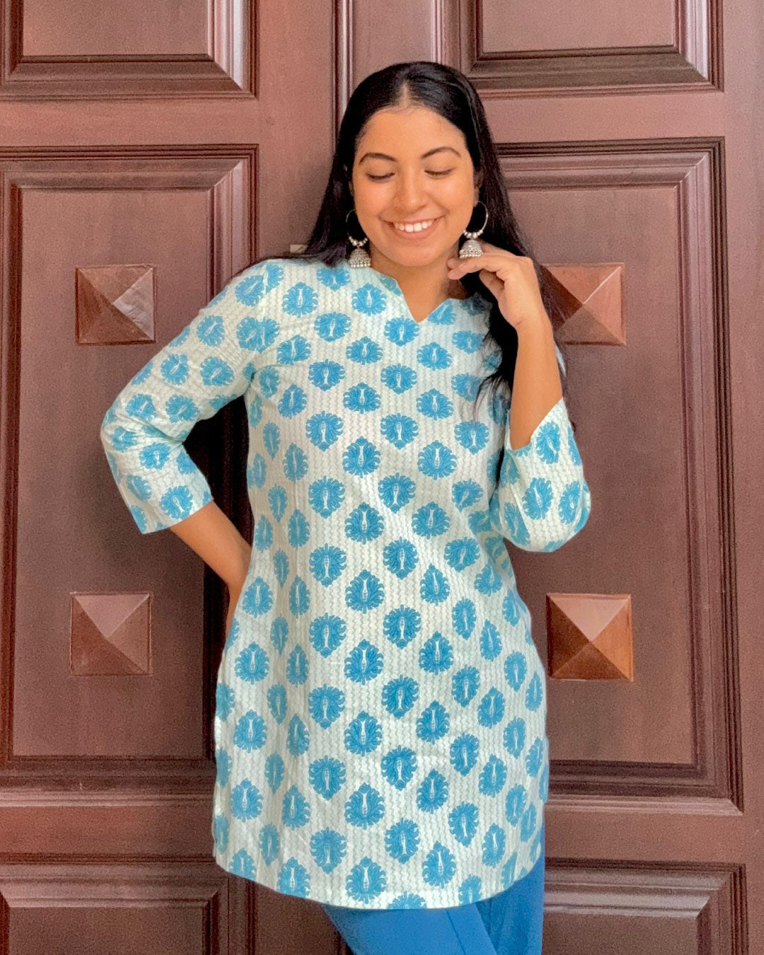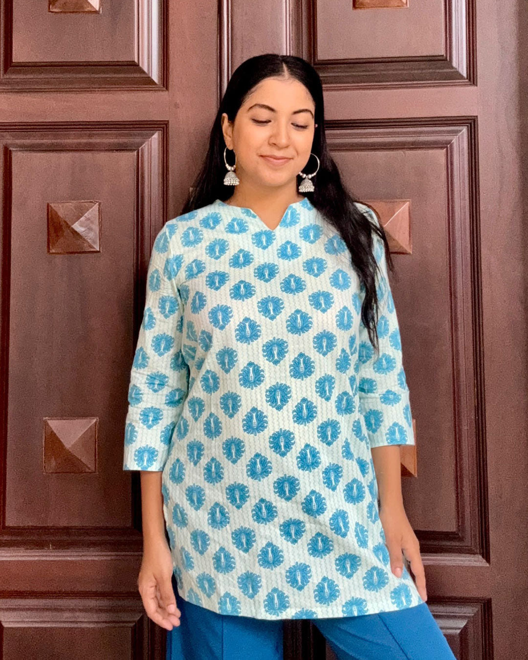 Embrace effortless elegance with this Sky Blue Hand Block Print Short Kurti, a perfect fusion of tradition and contemporary style. Made from soft, breathable cotton, this 30-inch kurti features a soothing sky blue and white color combination with a hand block floral motif, adding a fresh and graceful touch to your everyday wardrobe. The straight-cut design ensures a comfortable yet flattering fit, while the 3/4th sleeves enhance its chic appeal.