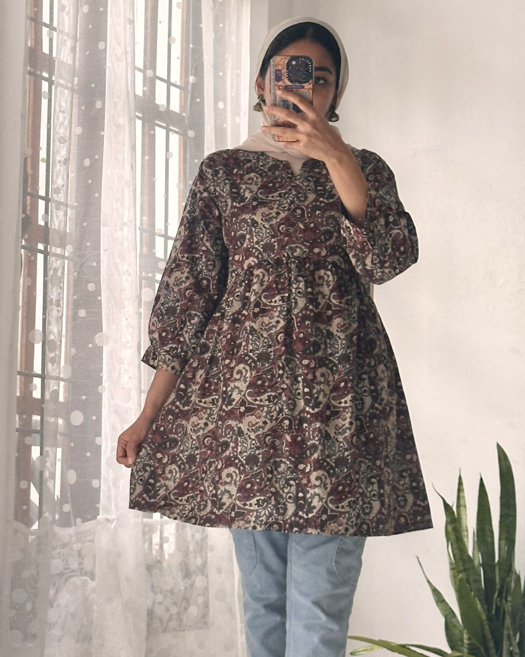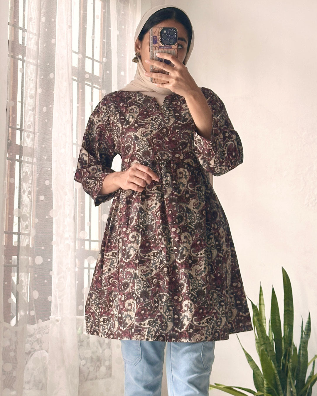 “Step into timeless style with Ishaaa’s brown and beige gathered peplum top – where elegance meets comfort.”